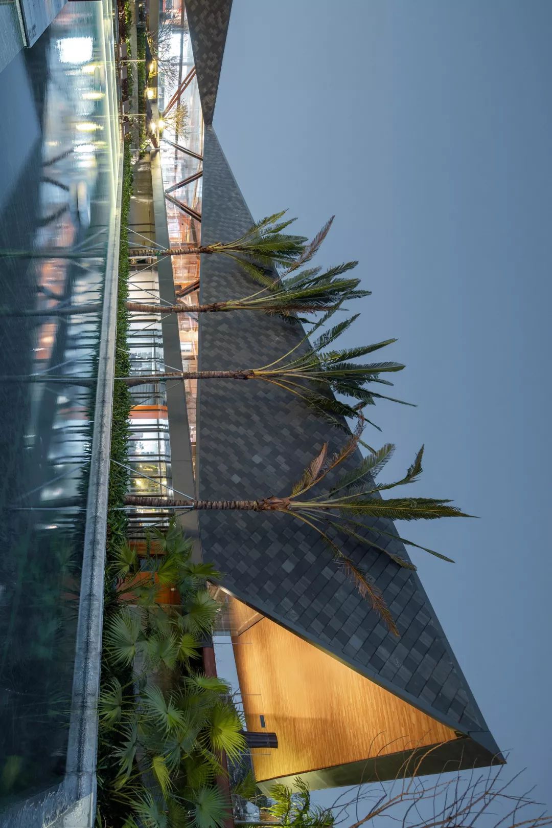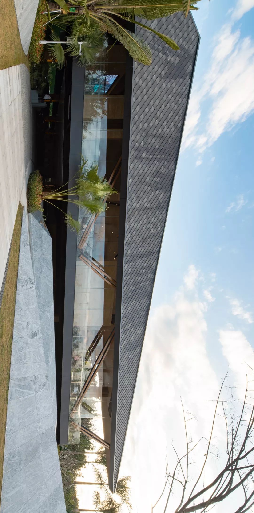建筑設(shè)計(jì)通透開放,自由的屋頂結(jié)合靈活的異形結(jié)構(gòu),同生機(jī)勃勃的自然環(huán)境相融共生。室內(nèi)延續(xù)建筑所賦予的意義,以其為載體,在室內(nèi)空間延展、重組,詮釋其所構(gòu)成的涵義。