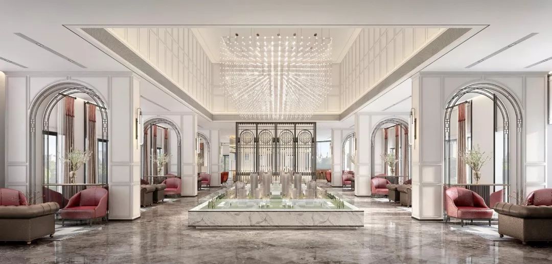 軟裝設(shè)計中,大廳呈對稱構(gòu)圖,璀璨耀眼的立體矩塊燈陣,星星點點的細節(jié)拼湊出米字的大致輪廓,又似不經(jīng)意間抒寫著英倫格紋的疏密意象,層疊有致,意態(tài)萬千;洽談區(qū),在歐式花線圓拱形制的隔斷基礎(chǔ)上,黑色鐵藝架、紅色單椅、黑色長沙發(fā)圍合金色茶幾構(gòu)就一個舒適放松的商務(wù)對談空間;飄香玉蘭、復(fù)古時鐘、噴泉雕塑無一不彰顯著精致細節(jié),光影綽約間,英式情調(diào)漫延。