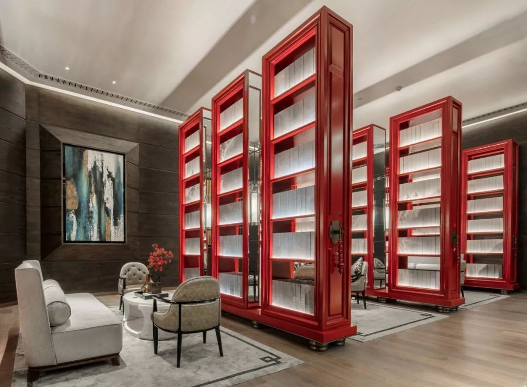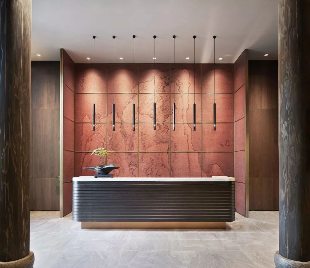 從古雅的庭院入宅,室內(nèi)是以現(xiàn)代清簡材質(zhì)為形,以東方哲美意涵為里的風(fēng)韻藝境。步入接待門廳,納入眼里的是一面氣勢磅礴的藝術(shù)墻,正統(tǒng)且濃郁的朱紅色調(diào),與當(dāng)?shù)貕验煹暮@艘庀?,用以傳統(tǒng)手工藝漆線雕制作,是設(shè)計對唐朝壁畫與雕刻藝術(shù)文化的另一種延續(xù)與解讀。