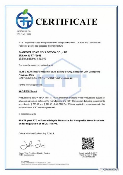 在2019年7月,索菲亞康純板刨花板板芯順利通過檢測,獲得美國環(huán)境保護(hù)署(EPA)無醛豁免認(rèn)證——EPA NAF,這是康純板板芯高環(huán)保等級的有力證明。