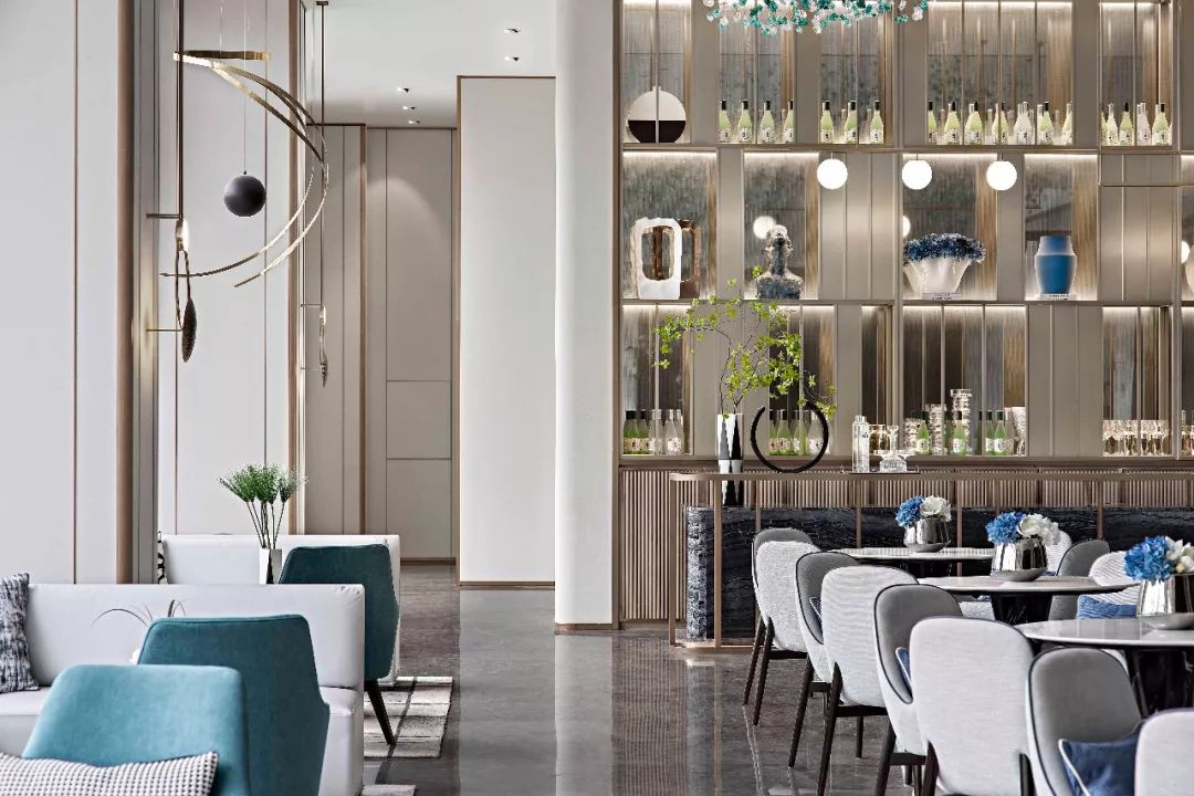 洽談區(qū)奶白的色調(diào)勾勒簡潔、寧謐的商談氛圍,翡翠綠與透明小水晶疊合而成的裝飾吊燈,星光點(diǎn)點(diǎn),觥籌交錯(cuò)。有序的線條適度糅合,豐富了空間的層次,浪漫感與文脈精神合為一體,增加空間的藝術(shù)感染力。