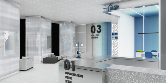 步入展廳的第一站,是帶著未來虛擬觀感的柜臺接待處,利用航空站作為設(shè)計理念,象征著即將帶領(lǐng)觀眾,潛入體驗全新的三維建筑科技世界。