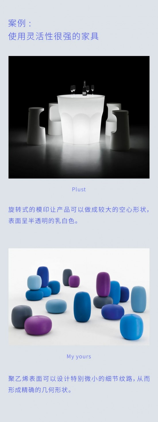 由于聚乙烯材料的特性,因此可以用來生產(chǎn)特別的形狀或大尺寸的產(chǎn)品。如果設(shè)計(jì)人員需要一種靈活性很強(qiáng)的材料,那聚乙烯是一種很好的解決方案。它也是一種可大量染色的材料,還可以在印刷后涂漆。因此,采用這種材料可以設(shè)計(jì)出不同效果的產(chǎn)品,啞光的或亮光的,光滑或具有浮雕微紋理等。
