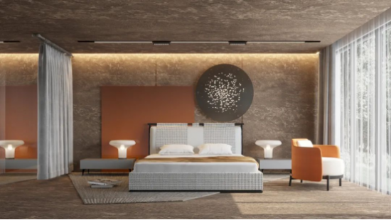 簡約化的色彩鋪墊、點亮,奠定輕奢感的室內格調,CBD家居·金豹 | J038軟床,皮質靠包設計別致,疊加淺色千鳥格布套,與床身完美呼應,溫馨感十足,彰顯獨特的審美品味,優(yōu)雅寧靜的睡眠氛圍。