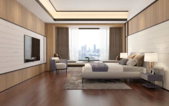 胡桃木色地板典雅大方,賦予睡眠空間寧靜禪意。多處細(xì)節(jié)融合線條元素,相互交映,營造獨(dú)特而統(tǒng)一的空間秩序,帶來至簡(jiǎn)而美的生活體驗(yàn)。
