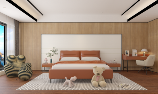 CBD家居·金豹 | J007軟床,暖橙色提亮空間,靠包輔以線條內(nèi)嵌設(shè)計(jì),體塊感更顯飽滿,自然倚靠,達(dá)到舒適與美感的平衡。創(chuàng)意單椅、簡(jiǎn)易書桌各立于一角,打造出多元化場(chǎng)景,治愈溫馨。