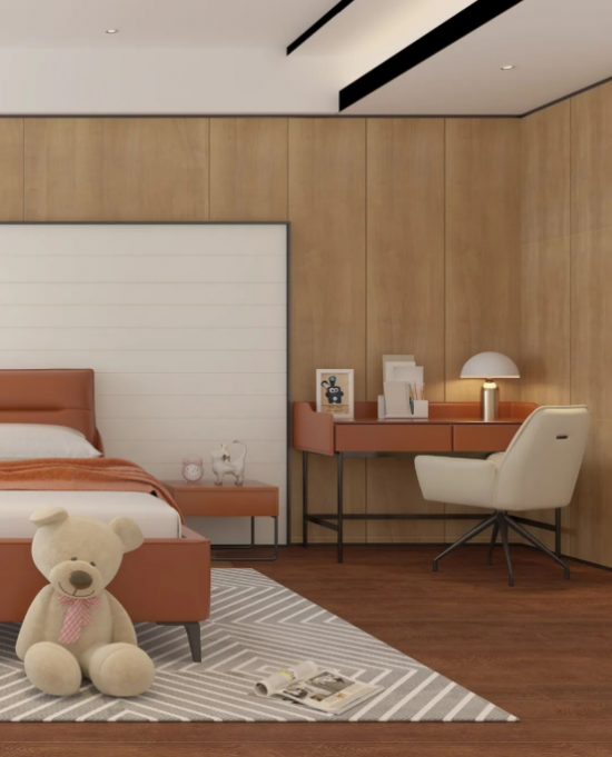 將原木風(fēng)的占比降低,男孩房簡(jiǎn)約而兼具輕奢質(zhì)感。