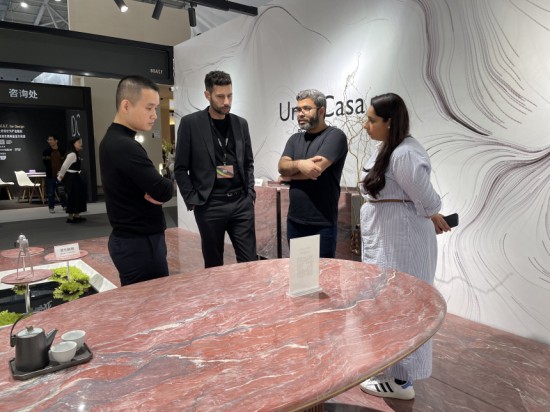 在其展位上,一張淺白色大理石餐桌紋理細(xì)膩,透出溫潤(rùn)光澤。遠(yuǎn)看,“桌腿”藏在輕盈的天鵝絨簾中,石板就像飄浮在空中。
