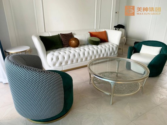 輕奢沙發(fā)的經(jīng)典拉扣,自信彰顯知性與優(yōu)雅;曲線休閑椅個性圓潤外觀,體驗舒適,結(jié)合新古典韻味的茶幾、圓幾和黃銅大理石竹節(jié)角幾、電視柜等家具。多元化的設(shè)計元素和設(shè)計思維,活躍在同一個空間里,鮮活明確的表達(dá)家的自由、松弛和愜意!