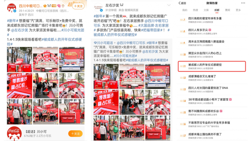 成都東郊記憶人流如織,現(xiàn)場活動吸引大批群眾圍觀,加上用戶在各大新媒體平臺積極分享活動訊息,#被成都人的開年儀式感硬控 直接登上成都同城熱搜榜,閱讀量累計高達5千萬,話題最高沖上微博同城熱搜榜第11位,并持續(xù)在榜超24小時!