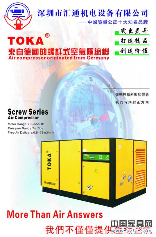 公司設(shè)計(jì)、銷(xiāo)售的主要產(chǎn)品有:TOKA®(特高)牌螺桿式空壓機(jī)、活塞式空壓機(jī)、儲(chǔ)氣罐、冷凍式干燥機(jī)、吸附式干燥機(jī)、過(guò)濾器等設(shè)備;設(shè)計(jì)制造:車(chē)間水簾負(fù)壓降溫工程、不燒油不燒電的企業(yè)熱水工程。TOKA®牌空壓機(jī)被評(píng)為2007年中國(guó)質(zhì)量公認(rèn)十大知名品牌。