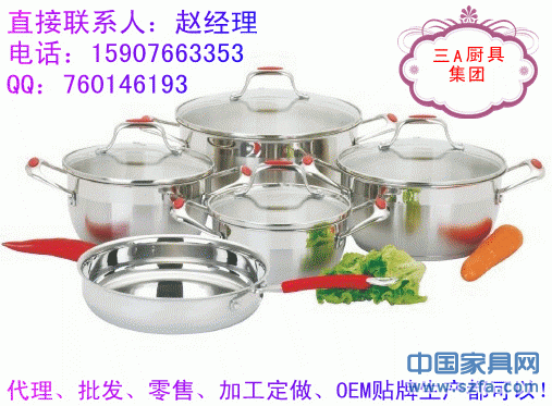 高檔不銹鋼廚具、湯鍋、炒鍋、煎鍋、奶鍋、刀叉、碗筷碟子等眾多款式,批發(fā)、零售、代理還可以加工定做,OEM貼牌生產(chǎn)!廠家直銷?。?!櫥柜、炊具等產(chǎn)品配套的最佳選擇!消費者最愛的禮品,贈品!