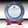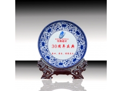 青花是單一的色彩,用單一的色彩去體現(xiàn)豐富的內(nèi)容。這在手法的運(yùn)用上,往往需要借助一些青花以外的東西來(lái)達(dá)到。而這青花以外的東西,就是瓷的“白”。青花正是藍(lán)、白之間的藝術(shù)。我們要用青花去描繪山水,正是運(yùn)用了瓷的白,才能顯現(xiàn)出山水的立體感和層次感。除此以外,當(dāng)今許多現(xiàn)代的畫師也還常常運(yùn)用點(diǎn)睛之筆來(lái)體現(xiàn)它的韻味。如畫荷塘的一角,對(duì)于荷花,常常以紅色來(lái)點(diǎn)綴。又如在荷葉上畫一只蜻蜓,對(duì)蜻蜓的眼睛,用黃色來(lái)點(diǎn)綴。這種點(diǎn)綴使整個(gè)構(gòu)圖顯得豐滿和有立體感、層次感,也增加了它的韻味。當(dāng)然青花陶瓷紀(jì)念盤構(gòu)圖的立體感和層次感,也可以通過(guò)用色的濃淡來(lái)體現(xiàn)。使單色調(diào)呈現(xiàn)在人們面前的是一個(gè)完整、生動(dòng)、豐滿的畫面,所以陶瓷紀(jì)念盤,是一個(gè)表達(dá)藝術(shù)和情感的載體,也是一種心靈寄語(yǔ)的永恒,在陶瓷紀(jì)念盤上面燒制您心中的圖案和美好的寄語(yǔ)來(lái)表達(dá)給友人給親人的一種美好的祝福。