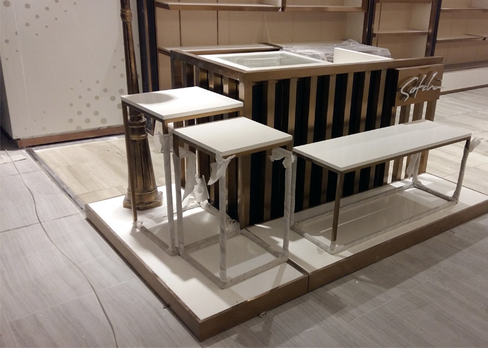 鞋類展柜主要采用環(huán)保型木板材料,防火板,有機(jī)板,玻璃,LOGO制作而成,其具有堅(jiān)固耐用,方便移動(dòng),精致美觀大方的特點(diǎn),也能充分體現(xiàn)陳列物品的產(chǎn)品形象、品牌形象及企業(yè)形象。鞋類展柜產(chǎn)品經(jīng)過多次打磨拋光,使展柜表面平整光滑,并且選用上等高環(huán)保油漆,手感光滑,顏色均勻,光澤度好,在經(jīng)過高溫烤制而成,經(jīng)久耐用,不易刮花。