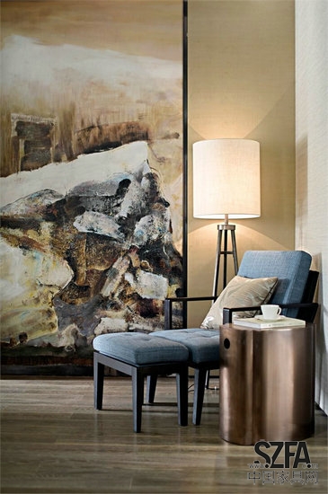 建筑與藝術(shù)作品相結(jié)合,可以得到精神上的升華,以至成為一種文化的象征。步入玄關(guān),淡金色的案幾雕塑與天圓地方的抽象造型寓意和諧與完滿。挑高逾六米的客廳以紋理豐富的藍(lán)貝魯大理石飾墻,更宛若徐徐展開(kāi)的水墨畫卷,清雅寫意。