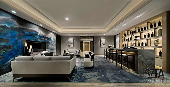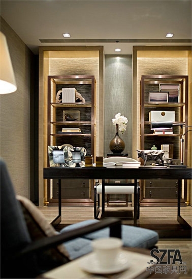 主人套房?jī)?nèi)設(shè)書房,選用藍(lán)色銀絲底布及鏡底夾絲玻璃,配襯古銅色和深色捫皮組成的書架,營(yíng)造雋逸爾雅的書香氛圍。