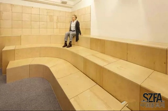 Taylor and Miller為他們開發(fā)了辦公室隔墻和家具系統(tǒng),都是由不同尺寸和直線形狀的基本膠合板箱做成的。由多個隨機的方式安排的盒子組成了隔墻,這樣就允許了空間中的視覺連通性,當(dāng)移動到新的空間后,原來的盒子被重新組織,用了單一的盒子形狀來搭建整面隔墻。對于設(shè)計師來說,這個想法是:隨著辦公室的擴(kuò)展,在新的空間里增加了更多的勞動力,在人口密度增加和任務(wù)有重疊的情況下,辦公有一定程度的紊亂,該建筑體系的設(shè)計,將抵消這一混亂走向;盒子的重復(fù)性和紋理將這個工作間與下一個工作間分開,給員工提供了一個安靜的空間和隱私分層。