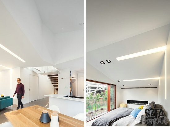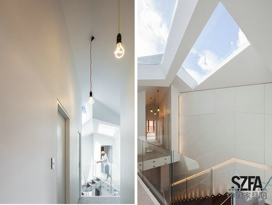 屋頂形式為有用而寬敞的平面布置提供了機(jī)會(huì),內(nèi)部包含了開放式的生活空間、臥室、書房、浴室、服務(wù)空間、車庫以及內(nèi)部循環(huán)空間,其中內(nèi)部循環(huán)空間指位于建筑中心,直達(dá)建筑頂部的雕塑般的樓梯墻和留白空間。