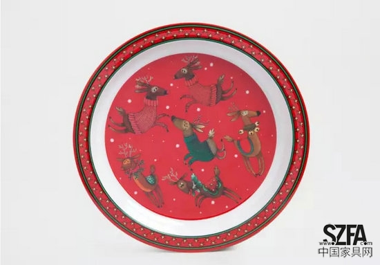 餐盤上的麋鹿漫畫更加形象有趣,六只穿著鮮艷服飾的麋鹿或立或跳,表情生動。