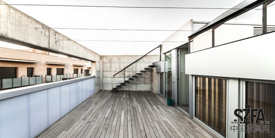 兩個主要的立面擁有三層圍護(hù)。它們就像一個過濾器來調(diào)節(jié)內(nèi)部的光線、溫度和舒適的環(huán)境。最外層是4cm的聚碳酸酯,內(nèi)層是雙層玻璃,可活動的鋁制百葉窗位于這兩層之間,我們有可能根據(jù)通風(fēng)要求打開或關(guān)閉位于南向的聚碳酸酯和玻璃之間的夾層:在冬季的時候,夾層會保持關(guān)閉狀態(tài),百葉窗將轉(zhuǎn)向內(nèi)部以便得到更多的光照。在夏季的時候,夾層將保持打開,百葉窗將轉(zhuǎn)向外部,如此可以避免室內(nèi)遭受陽光直射。如果需要,也可以完全打開內(nèi)層的玻璃讓整個空間從南到北產(chǎn)生對流通風(fēng)。房子的設(shè)計利用基本的技術(shù)得到最舒適的環(huán)境。我們只用了3個通風(fēng)設(shè)備:一個通風(fēng)灶臺,一個風(fēng)機(jī)系統(tǒng)和一個管道恒溫器,將積累在兩倍高度的熱空氣帶到較低的空間,并利用熱泵作為一個額外的支持。