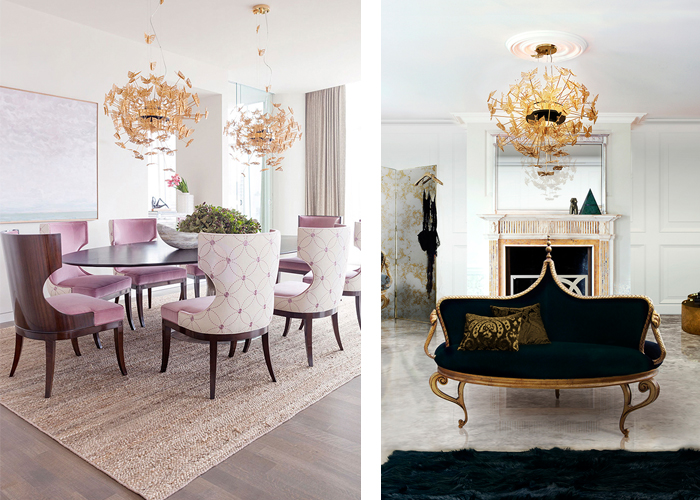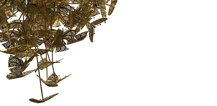 想象一群異域風(fēng)情的蝴蝶翩翩飛舞,這就是Nymph吊燈的靈感來源。這群優(yōu)雅的蝴蝶飛舞的姿態(tài)被KOKET用金銀絲勾勒出來,每一只蝴蝶都是由大師級別的工匠純手工制造,這是最無與倫比并且獨(dú)一無二的藝術(shù)品。