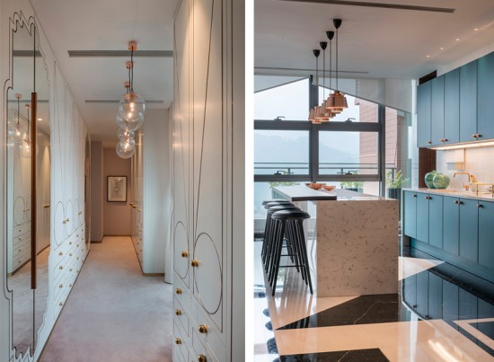 在設計的同時,我們也非常注重于周圍環(huán)境的相互協(xié)調。坐落于高樓頂層的復式雅居,脫離著城市應幽的喧囂繁雜,反之獲得的是如同擺脫塵世的安然自得,低調卻又不失華麗的生活色彩。Thomas  Dariel希望能夠講這一種生活理念通過設計來傳遞??臻g中反復出現(xiàn)的幾何線條,高雅深邃的藍色及綠色宛如窗外景色一般,青山,藍天。相互輝映。這些存在于空間中的點滴細節(jié),無一不訴說著一種沉靜,一種雅致。