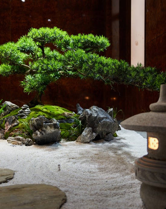 設(shè)計(jì)之初,印象空間就設(shè)想把自然景觀融入營銷中心,與周邊環(huán)境相呼應(yīng),拉近人與空間的距離。在現(xiàn)場施工條件有限的前提下,綜合各種因素的考量,最終以景觀軟裝來呈現(xiàn)。一體成型的景觀軟裝擁有成熟的模擬系統(tǒng),可控的土壤溫度、澆灌循環(huán)等維持著生態(tài)蓬勃,無論是呈現(xiàn)效果,還是后期維護(hù),都無可挑剔。