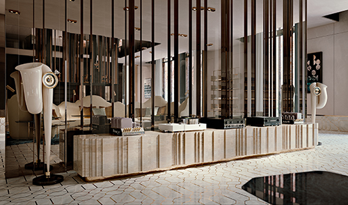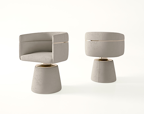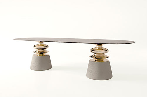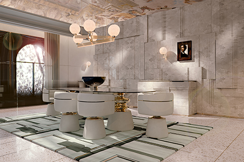 Alessandro La Spada從經(jīng)典產(chǎn)品Cortes 上得到靈感,設(shè)計(jì)了這個(gè)風(fēng)格鮮明、精巧高雅的新餐廳空間。包括一個(gè)橢圓形桌子和圓形輪廓的椅子。大理石桌子的基座由白色的圓錐形結(jié)構(gòu)和鍍金的不規(guī)則柱子構(gòu)成,給予強(qiáng)大的支撐力的同時(shí)也帶來層次豐富的視覺享受。