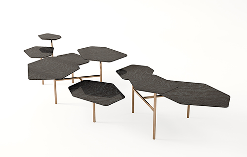 像山脊一般流暢柔順的背部呈現(xiàn)出一種流線型的和諧韻律。為了配合整個(gè)空間場景,一系列具有最小結(jié)構(gòu)的桌子錯(cuò)落有致地?cái)[放,由大理石桌面和黃銅支架組成。