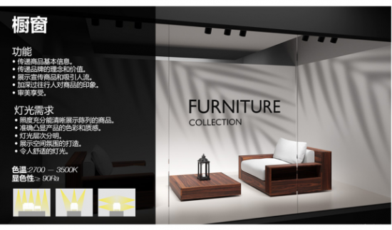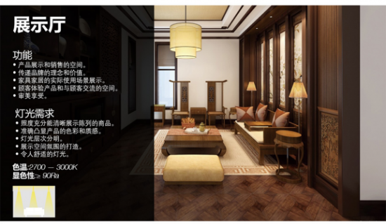 不同材質(zhì)的紅木家具有其獨特的顏色,所以展廳燈光要選擇適合家具顏色的色溫。 在選擇燈光時,要選擇與家具顏色相近的色溫,如紅木家具多為紅色、暗紅色和棕色等,3000K以下的色溫最接近大部分 紅木家具本身的顏色。